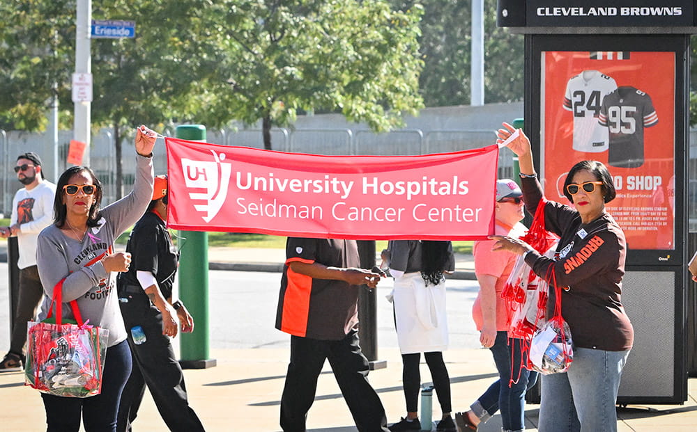 Two women hold a UH Seidman Cancer Center banner outside Browns Satdium. Courtesy David Sands Photography
