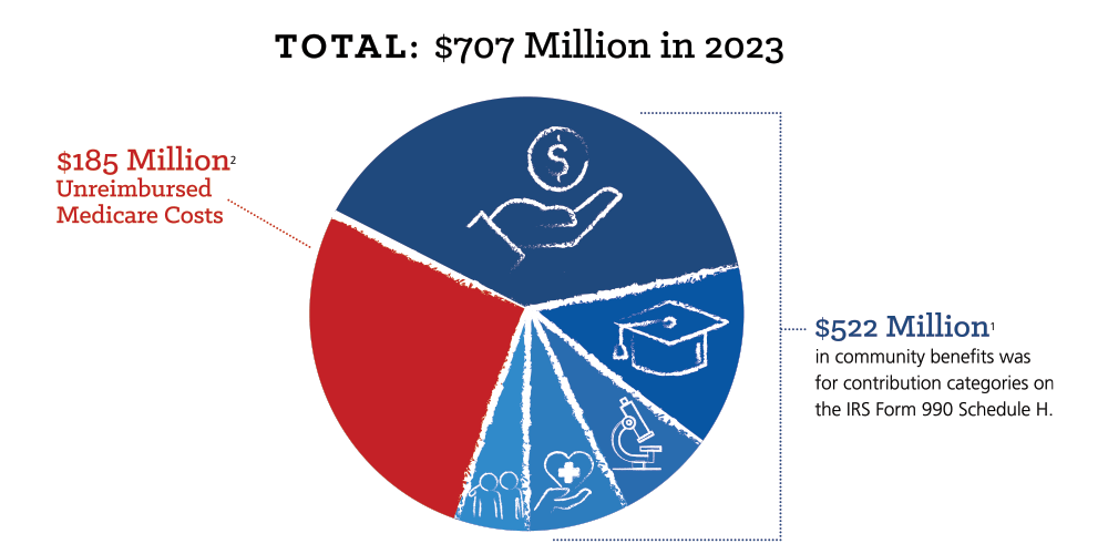 Since our founding in 1866, University Hospitals has upheld the principle that “the needy are the most worthy.” As such, we are proud to report that University Hospitals’ community health investment totalled $707 million in 2023. This reflects $522 million in traditional community benefit as defined by the IRS, as well as $185 million in unreimbursed Medicare costs. UH provides services to many patients who are insured by Medicare and Medicare Advantage payers. Because these payers reimburse at less than the cost of providing care, and at rates set by the government, they typically do not keep pace with inflation, and therefore UH sustains a loss on care provided.