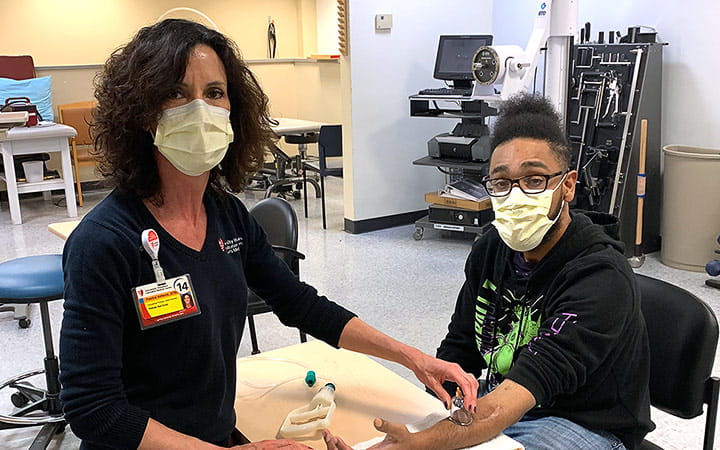 University Hospitals plastic surgeon Donald Harvey, MD, performed the complex reconstructive surgery to repair Stone’s injured left arm. Afterward, he ordered an aggressive plan of occupational therapy starting just two weeks after the surgery. Stone was referred to Patrice Volkens, OTR, an occupational therapist at University Hospitals Twinsburg Health Center.