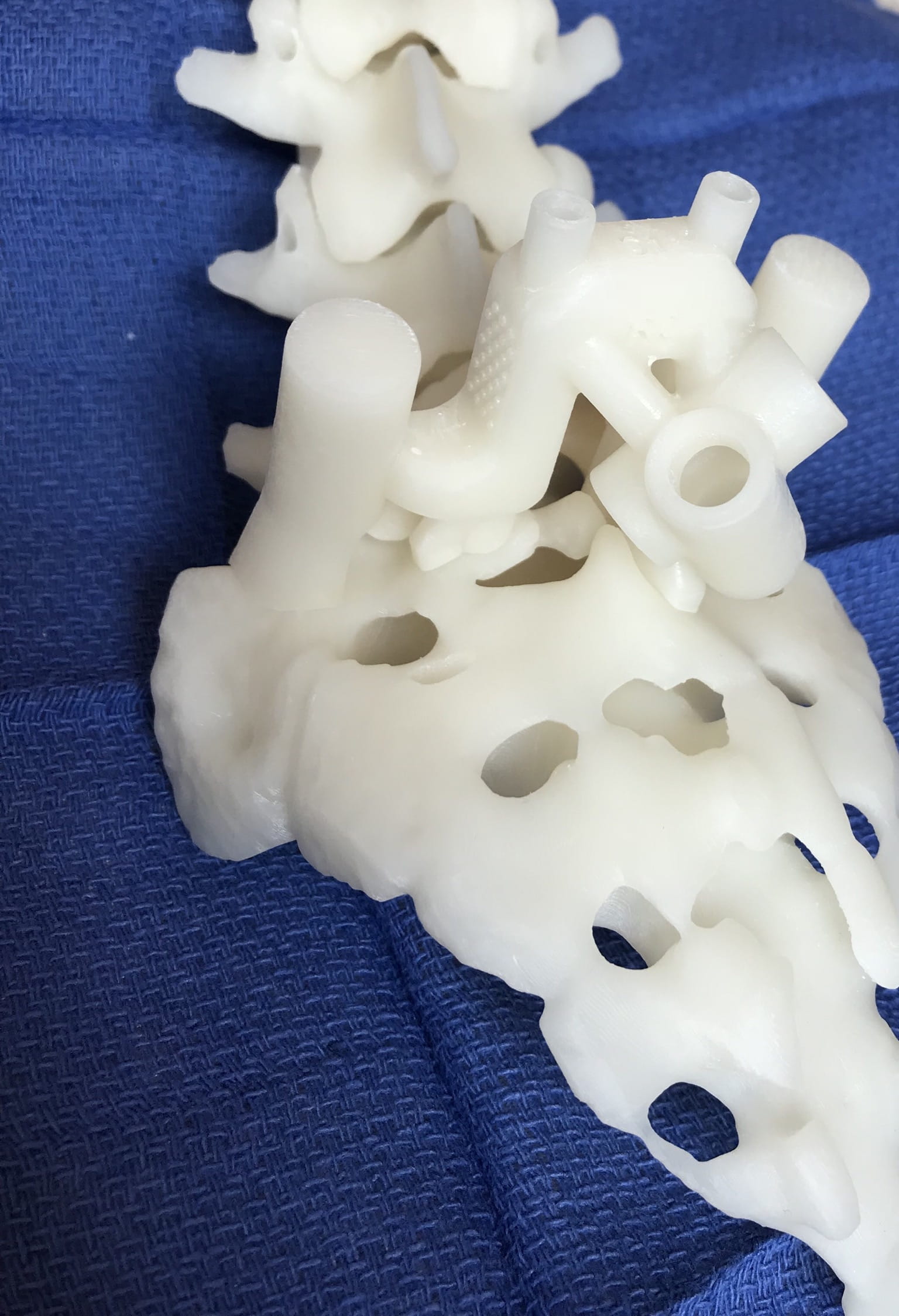 3D printed anatomic model of the patient’s spine with pelvic guide in place.