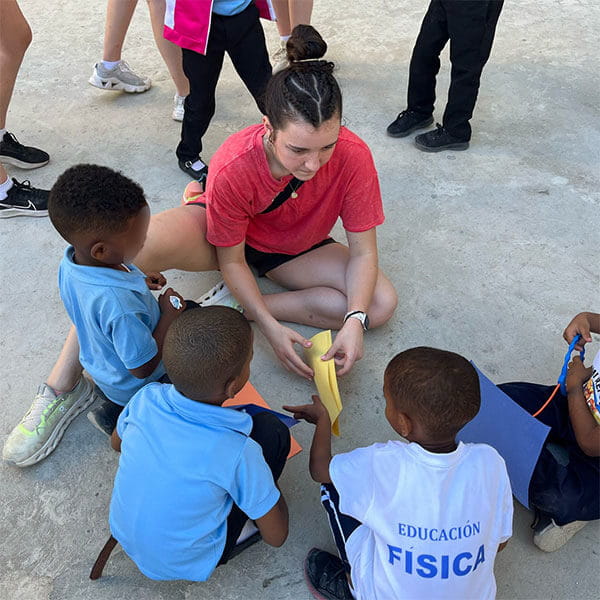 Kate Bollinger is in her element turning a patch of pavement into a classroom full of curiosity, and connection.For Kate, the trip to the Dominican Republic exemplified and magnified what she learned as an HSRC Scholar last summer, driving home real-world examples of health disparities, including lack of clean water, and illustrating the concepts of spatial epidemiology, the study of how certain diseases or health trends can be linked to the environment. For instance, in the Dominican Republic, Kate learned that most of the hospitalizations at the facilities she visited were due to motorcycle accidents.