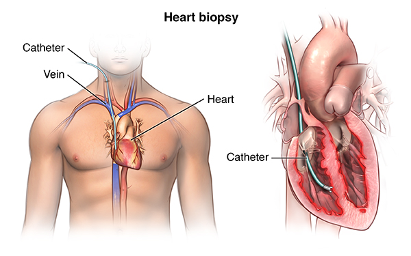 Your healthcare provider usually does the biopsy at the end of the right heart cath. Another catheter is inserted into a vein, usually in your neck. At the end of the catheter is a tool to take a tissue sample. The tiny pieces of heart tissue are sent to the lab for exam under a microscope. Doctors called pathologists examine your tissue under a microscope for signs of infection, inflammation, or abnormal cells. Your healthcare provider does the biopsy to see if your heart tissue is normal.