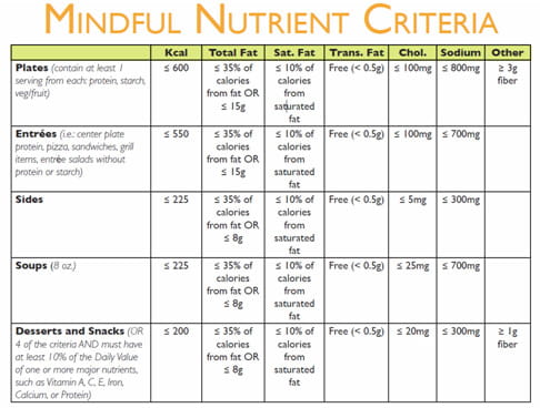 Mindful is Sodexo’s exciting new wellness approach. Mindful focuses on great flavors, satisfying portions, and healthy indulgence. Our goal is to make healthy food taste great. We are introducing more than 25 new Mindful recipes in our Café, all of which meet the new Mindful nutrient criteria shown in the chart below.