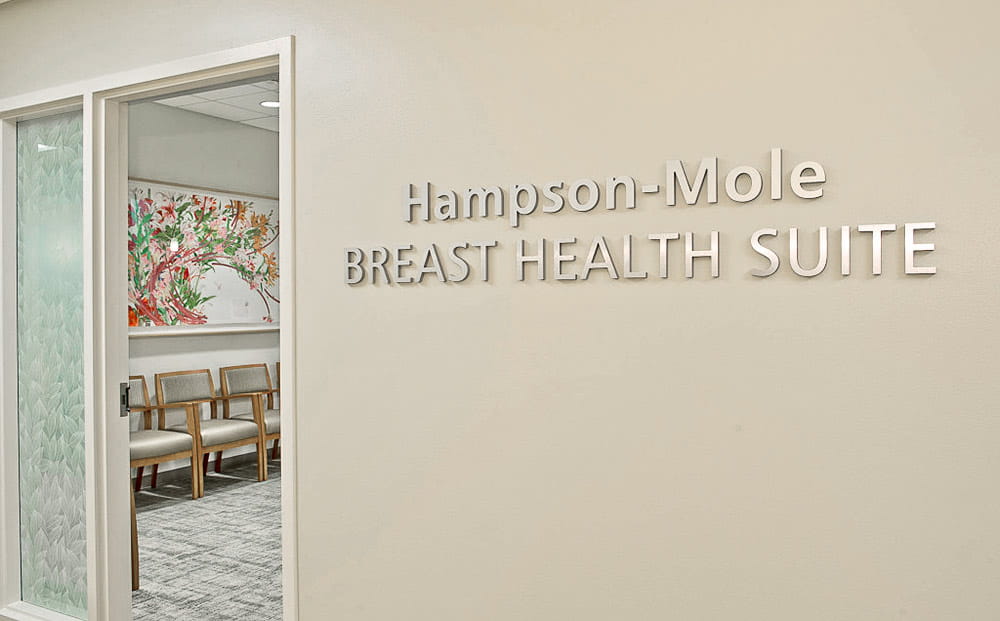 For our patients with breast cancer, The Hampson Mole Breast Heath Suite functions as a partner throughout a patient’s complex journey. We are a point of entry to the newest breast cancer treatment options and clinical trials and provide personalized, evidence-based care. Each patient works with a Certified Breast Nurse Navigator who functions as a companion from diagnosis through survivorship. We connect with local partners to deliver holistic care with resources available to treat the body, mind, and financial and social needs.