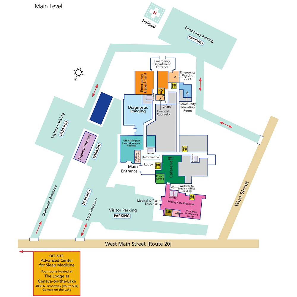UH Geneva Medical Center is located on Ohio Route 20 (West Main Street) just west of the West Main Street/South Broadway intersection in downtown Geneva. Simple access is available from I-90.