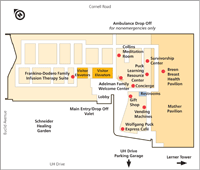 Visitors to UH Seidman Cancer Center may enter the building from the Lobby or First Floor. If you are taking an indoor path from one of the parking garages, you will enter UH Seidman Cancer Center on the First Floor. Once in the building, you can take the elevators or stairs down one floor to reach the Lobby. If you enter through the main doors of the building (via UH Drive), you will be in the Lobby.