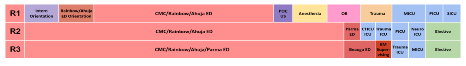 Our curriculum is designed to be dynamic and varied, incorporating case-based learning, mock code drills, simulated resuscitations, flipped-classroom sessions with online modules, hands-on procedure practice, and structured leadership development. Together, these experiences ensure that our residents graduate with the knowledge, skills, and confidence to excel in any emergency medicine environment.