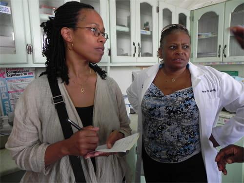 Margaret Larkins-Pettigrew, MD (right), and Tia Melton, MD, listen as a needs assessment is completed at Georgetown Public Hospital in January 2012. Drs. Larkins-Pettigrew and Melton started the Women, Neonates, Diversity, Outreach, Opportunities and Research program (known as WONDOOR and pronounced one door) at UH MacDonald Women’s Hospital to train Ob/Gyn residents in global health.