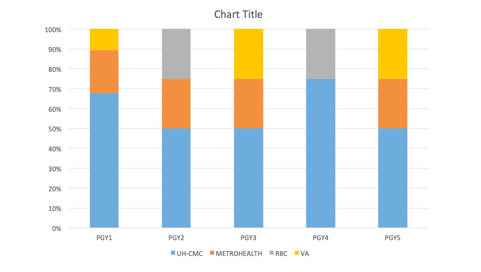 Chief residents assume complete responsibility for the outpatient clinic and inpatient medical care at UH Cleveland Medical Center, MetroHealth Medical Center and the Louis Stokes VA Medical Center. There is also a dedicated PGY5 rotation in otology at UH Cleveland Medical Center. Chief residents have direct supervisory responsibility over all junior members of the house staff as well as medical students.