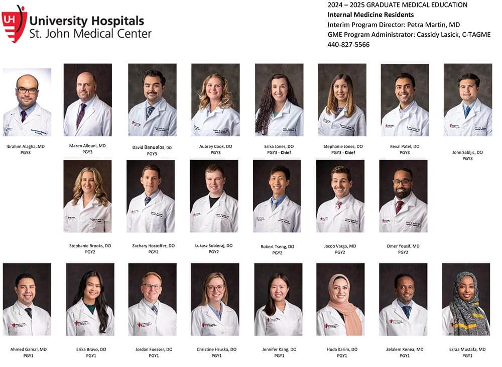 Residents at UH St. John’s Medical Center, in conjunction with Northeast Ohio Medical University receive an immersive and comprehensive education that prepares them for careers in hospital medicine, primary care and subspecialties.