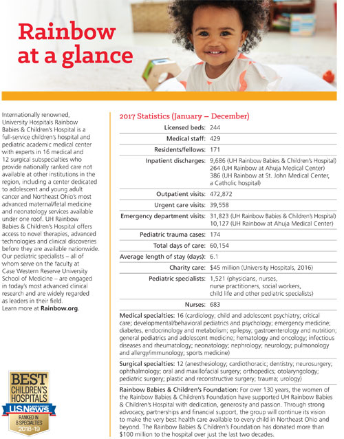UH Rainbow Babies & Children’s Hospital is a 244-bed, full-service children’s hospital and academic medical center. A trusted leader in pediatric healthcare for more than 130 years, UH Rainbow Babies & Children’s Hospital consistently ranks among the top children’s hospitals in the nation. As the region’s premier resource for pediatric referrals, UH Rainbow Babies & Children’s Hospital’s dedicated team of more than 1,300 pediatric specialists uses the most advanced treatments and latest innovations to deliver the complete range of pediatric specialty services for 750,000 patient encounters, annually.