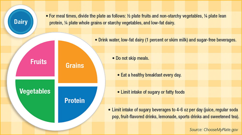 Nutrition guidelines: Follow MyPlate recommendations. More information about MyPlate is available at MyPlate.gov