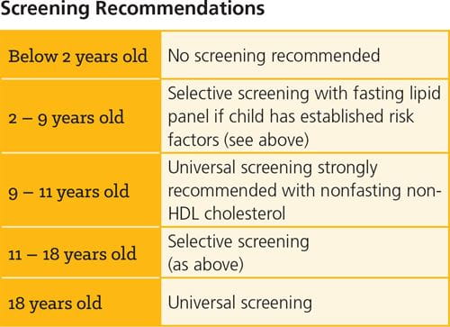 In 2011, the National Heart, Lung, and Blood Institute (NHLBI) Expert Panel published updated guidelines for cardiovascular health and CVD risk reduction in youth. One of the main points of these guidelines is the strong recommendation for universal lipid screening for patients who are between 9 and 11 years old and a second universal screening when patients are between 17 and 21 years old.