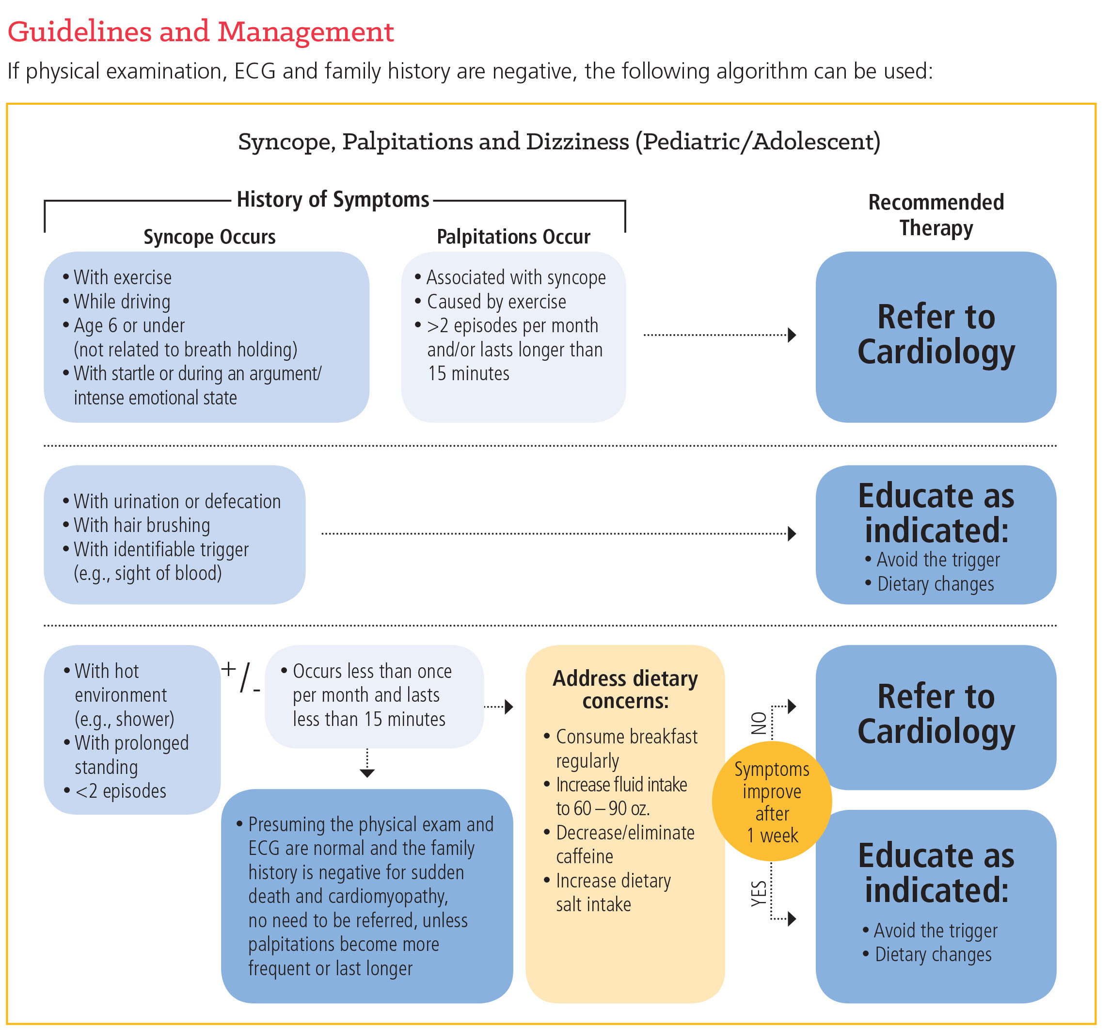 Syncope and palpitations are common complaints in the pediatric and adolescent age groups. Initial workup for patients presenting with palpitations is often aimed at ruling out an arrhythmia. Palpitations may be due to autonomic nervous system dysfunction that is the cause of dizziness and syncope; therefore, the workup for these symptoms (palpitations, dizziness and syncope) is along a continuum. The diagnostic and therapeutic modalities that are most appropriate for the individual patient can be determined after completing a patient history, physical examination, family history and ECG.