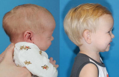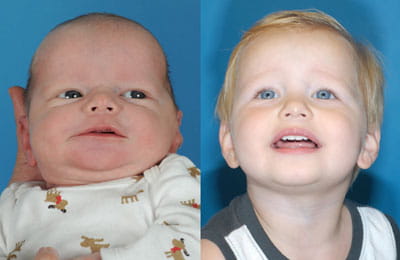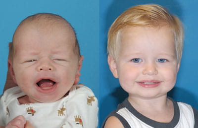 Craniosynostosis (right full cheek view; left image younger and pre-op; right image older and post-op)