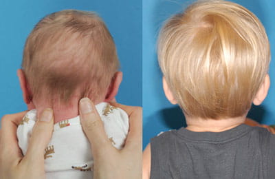 Craniosynostosis (back of head view; left image younger and pre-op; right image older and post-op)