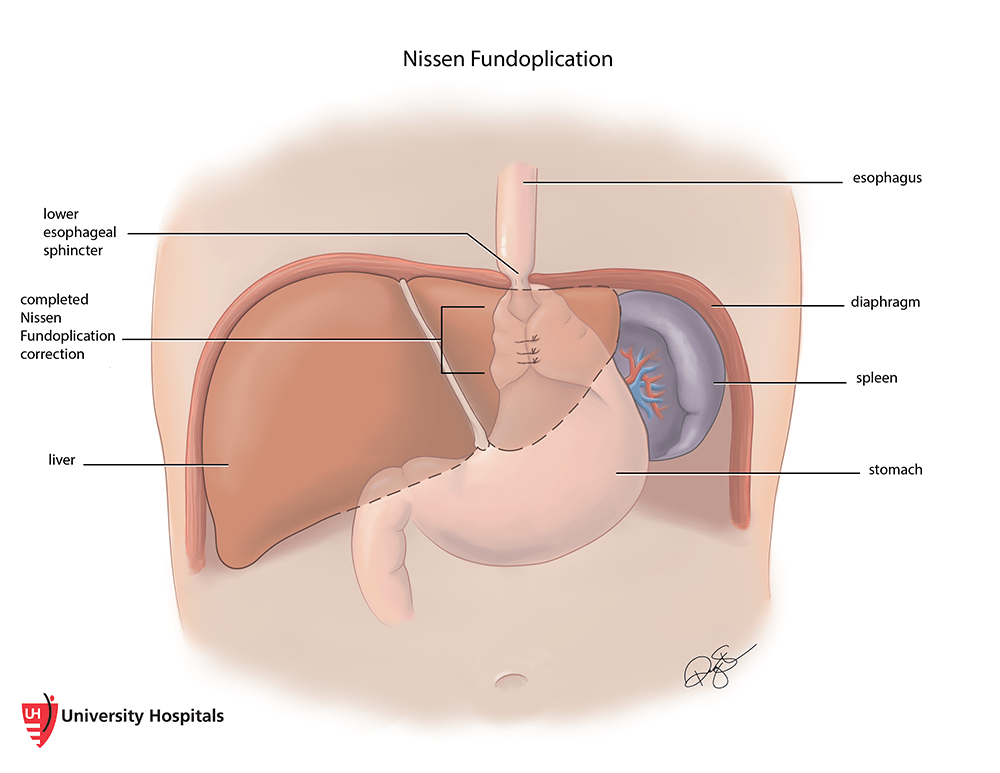 - Fundoplication: this laparoscopic procedure restores the function of the lower esophageal sphincter by wrapping the stomach around the esophagus and often combined with hiatal hernia repair. There are different fundoplications offered based on the strength of the esophageal body. The options are a complete fundoplication, also called a Nissen or a partial fundoplication, also called a Toupet fundoplication.