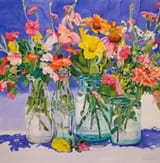 David Barba showcases his mastery of watercolor in Three Cans and Flowers. Watercolor is a notoriously unforgiving medium. Unlike oil painting, in which the pigments can remain wet and malleable for days and therefore can be reworked, marks made with watercolors are permanent. Barba pushes the medium to its limits by working in a photo-realistic style, requiring an especially keen eye, steady hand, and precise application.