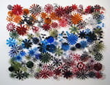 Julia Barello’s primary medium is discarded medical imaging film. She cuts the film into various shapes and patterns, loosely guided by the subtle colors within the film – hints of human body parts. Barello says that “Once cutting and organizing occurs, whispers are left of those individuals.” These abstract cuttings are then dyed and thoughtfully arranged to reveal larger, recognizable forms, such as birds, flowers or leaves. The film-shapes cast bold shadows that become essential to the overall viewing experience.