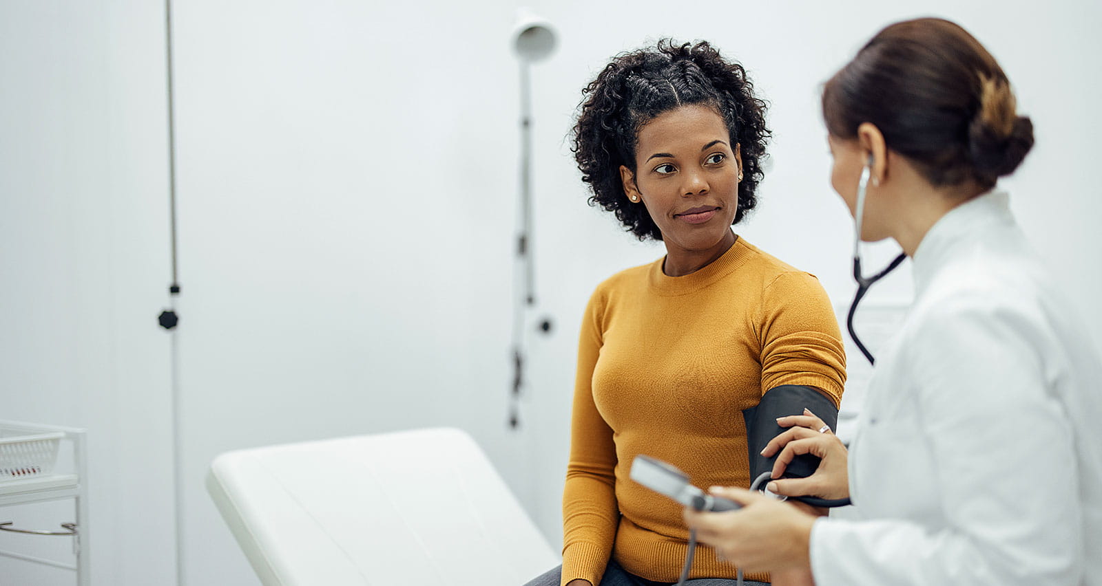 Doctor measuring the blood pressure of a smiling woman as a part of a medical exam
