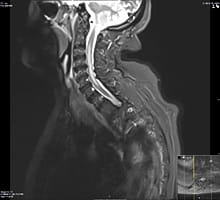 An MRI image showing a long area of inflammation in the spinal cord in a patient with NMO.