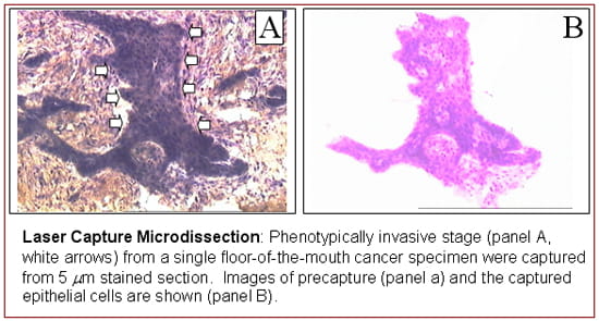 One clear problem with solid tumor tissue is that a clinically-obtained tissue sample often contains significant numbers of surrounding normal, dysplastic, stromal and quite likely, inflammatory cells. This confounds attempts at generating condition-specific expression results. Laser capture microdissection (LCM) provides a means to improve precision in obtaining only the desired tissue or cell type. The LCM apparatus separates a single slide-mounted tissue sections into user-selected groups of cells which can then be analyzed independently.